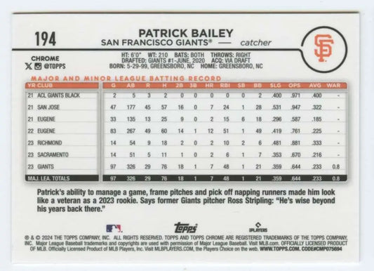 2024 Topps Chrome #194 Patrick Bailey NM-MT San Francisco Giants Baseball Card