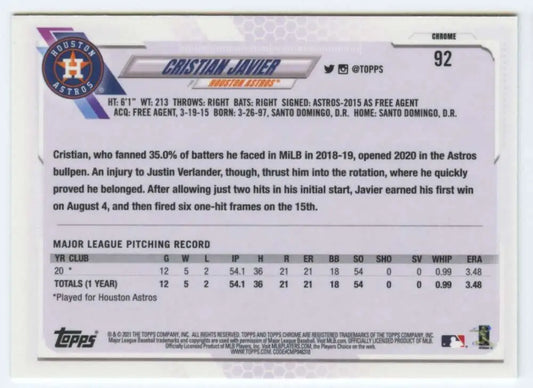 2021 Topps Chrome #92 Cristian Javier NM-MT RC Rookie Houston Astros Baseball Card