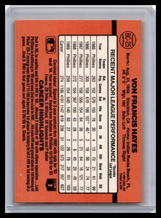 1990 Donruss #BC-25 Von Hayes NM-MT Philadelphia Phillies Baseball Card