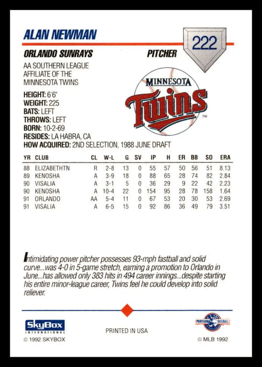 1992 Skybox AA #222 Alan Newman Orlando Sun Rays NM-MT Baseball Card