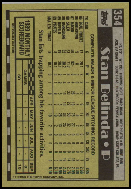 1990 Topps #354 Stan Belinda NM-MT RC Rookie Pittsburgh Pirates Baseball Card