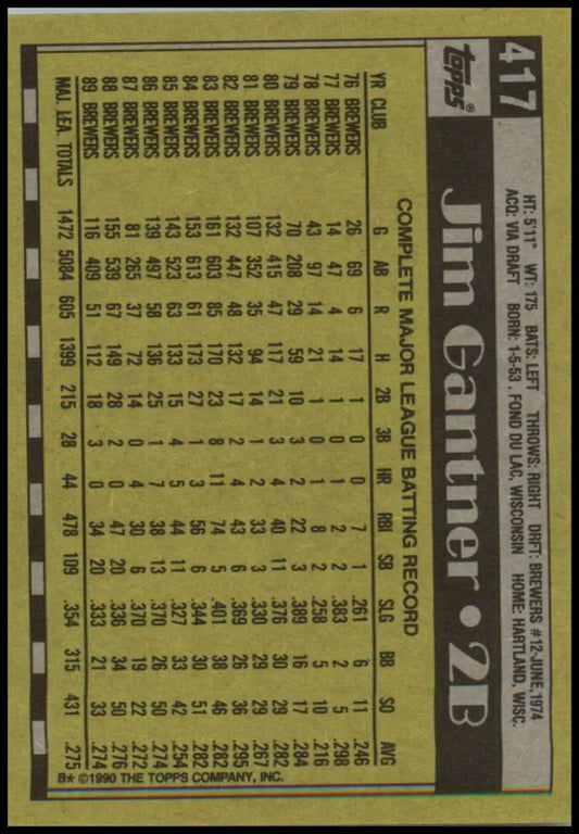 1990 Topps #417 Jim Gantner NM-MT Milwaukee Brewers Baseball Card