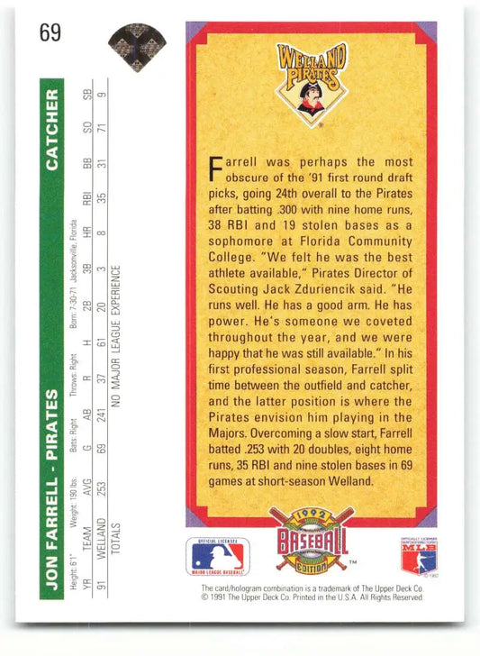 1992 Upper Deck #69 Jon Farrell NM-MT RC Rookie Pittsburgh Pirates Baseball Card