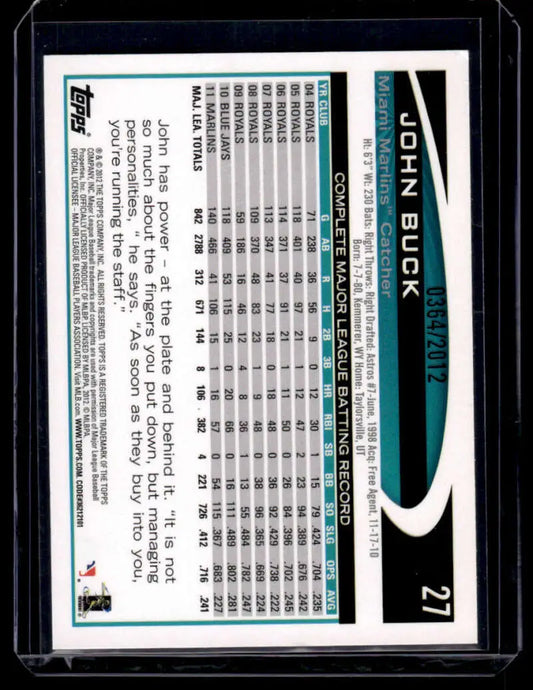 2012 Topps #27 John Buck NM-MT Miami Marlins Baseball Card