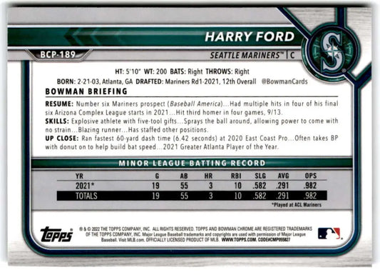 2022 Bowman Chrome Prospects #BCP-189 Harry Ford NM-MT Seattle Mariners Baseball Card