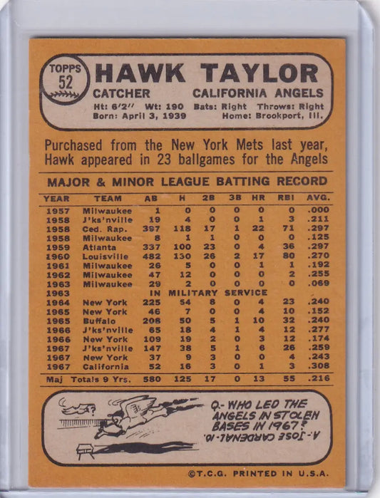 1968 Topps Baseball #52 Hawk Taylor - California Angels