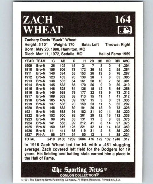 1991 Conlon Collection #164 Zack Wheat EX Excellent Brooklyn Dodgers Baseball Card