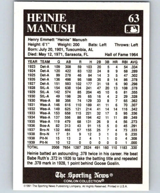 1991 Conlon Collection #63 Heinie Manush EX Excellent Washington Senators Baseball Card