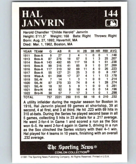 1991 Conlon Collection #144 Hal Janvrin EX Excellent Boston Red Sox Baseball Card