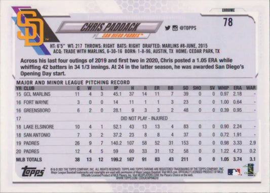 2021 Topps Chrome #78 Chris Paddack NM-MT San Diego Padres Baseball Card