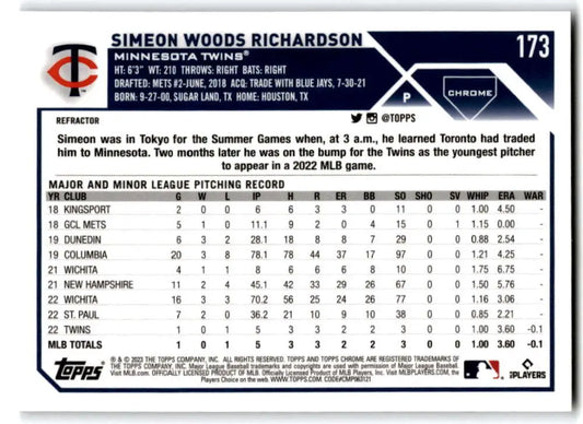 2023 Topps Chrome Refractor #173 Simeon Woods Richardson NM-MT RC Rookie Minnesota Twins Baseball Card
