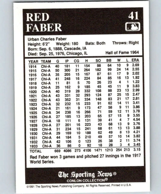 1991 Conlon Collection #41 Red Faber EX Excellent Chicago White Sox Baseball Card
