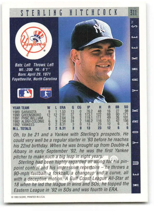 1993 Score #311 Sterling Hitchcock NM-MT RC Rookie New York Yankees Baseball Card
