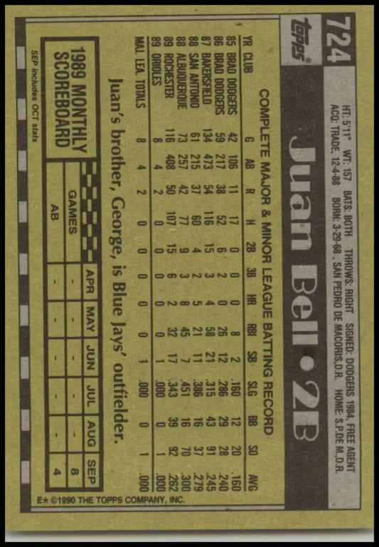 1990 Topps #724 Juan Bell NM-MT Baltimore Orioles Baseball Card