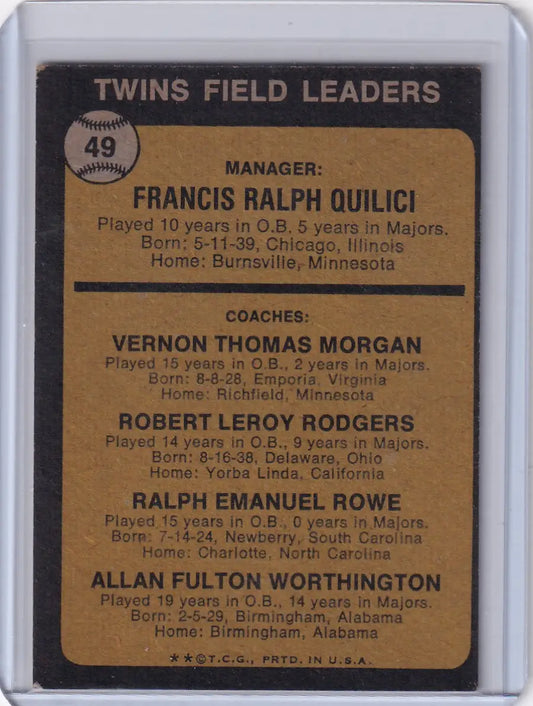 1973 Topps Baseball #49 Quilici/Rowe/Morgan/Rodger/Worthington - Minnesota Twins