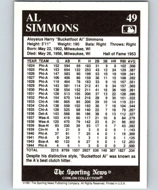 1991 Conlon Collection #49 Al Simmons EX Excellent Philadelphia Athletics Baseball Card