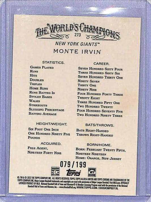 2022 Topps Allen and Ginter Chrome Refractor Magenta #273 Monte Irvin NM-MT 79/199 New York Giants Baseball Card