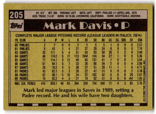 1990 Topps #205 Mark Davis NM-MT San Diego Padres Baseball Card