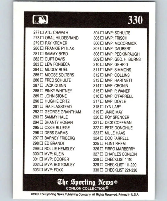1991 Conlon Collection #330 Checklist 221-330 EX Excellent Baseball Card