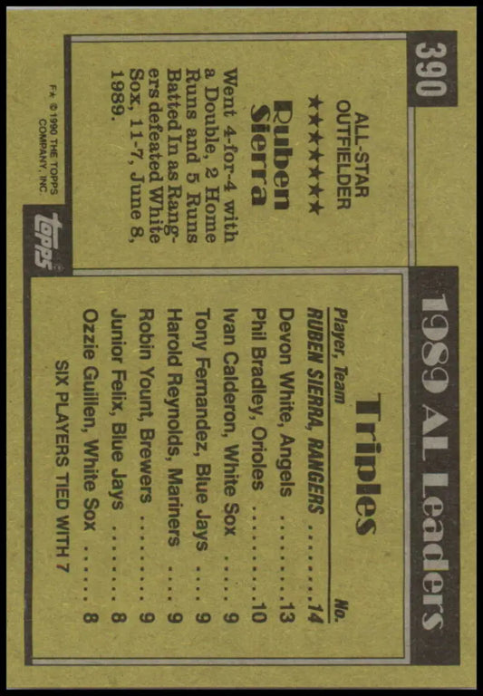 1990 Topps #390 Ruben Sierra AS NM-MT Texas Rangers Baseball Card
