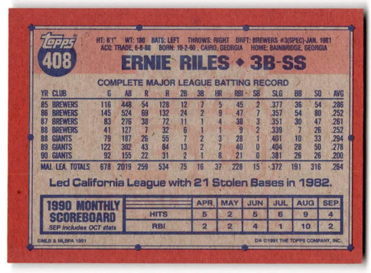 1991 Topps #408 Ernest Riles NM-MT San Francisco Giants Baseball Card