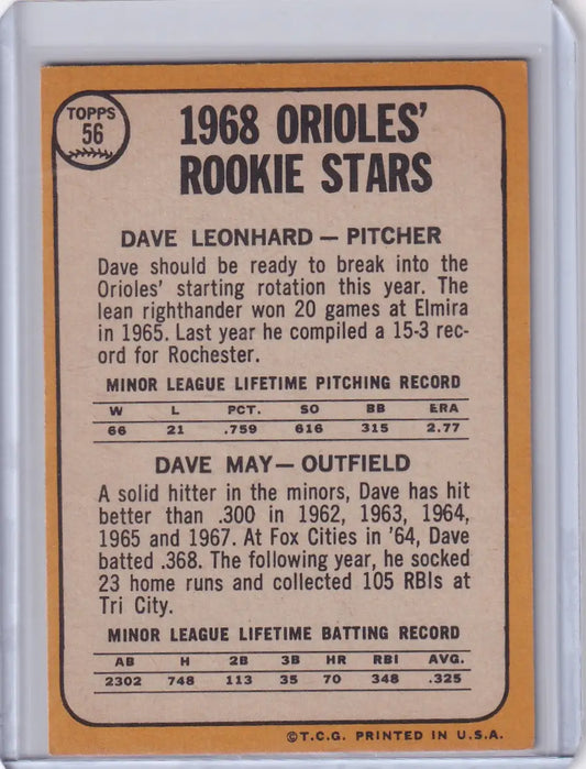 1968 Topps Baseball #56 Orioles Rookies - Dave Leonhard / Dave May RC