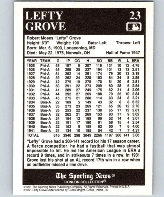 1991 Conlon Collection #23 Lefty Grove EX Excellent Philadelphia Athletics Baseball Card