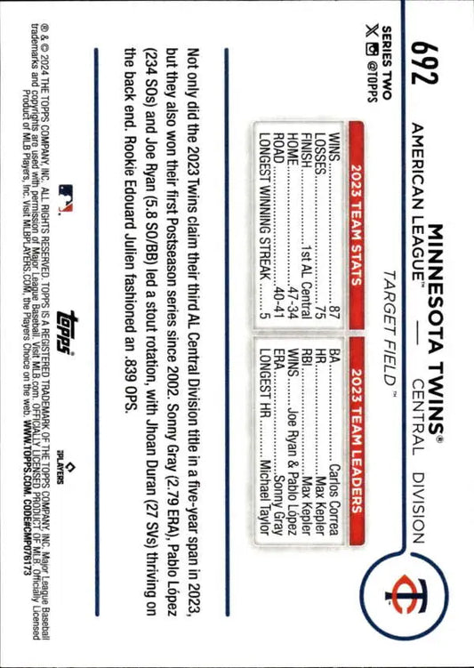 2024 Topps #692 Team Card NM-MT Minnesota Twins Baseball Card