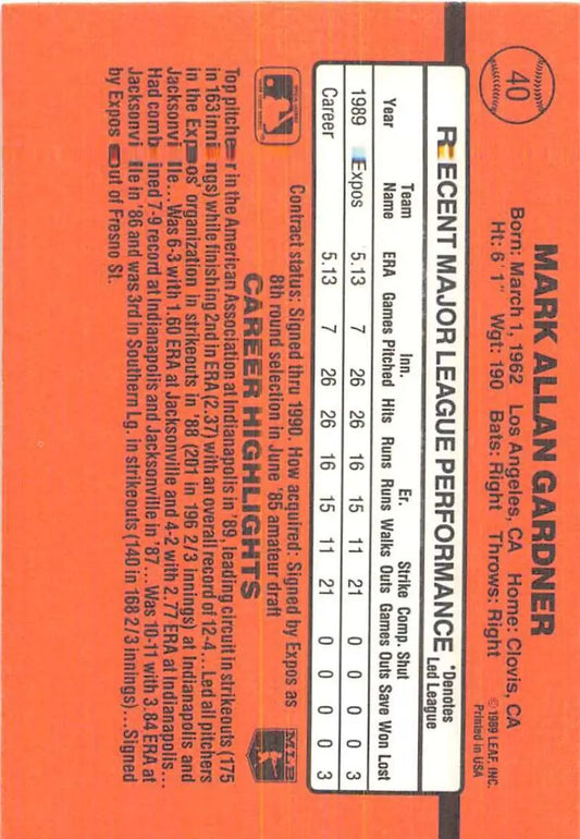1990 Donruss #40 Mark Gardner VG-EX RC Rookie Montreal Expos Baseball Card