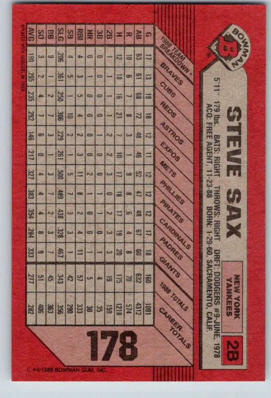 1989 Bowman #178 Steve Sax NM-MT New York Yankees Baseball Card