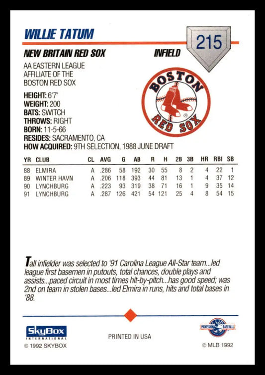 1992 Skybox AA #215 Willie Tatum New Britain Red Sox NM-MT Baseball Card