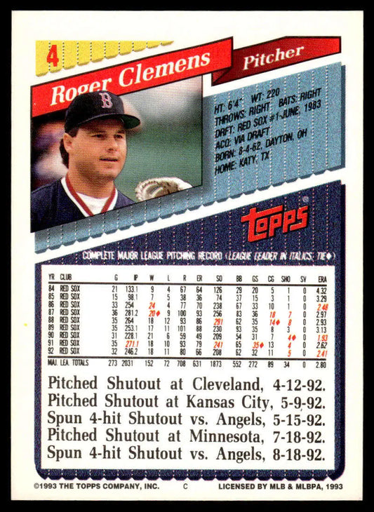 1993 Topps #4 Roger Clemens EX/NM Boston Red Sox Baseball Card