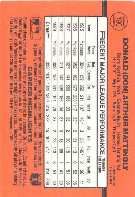 1990 Donruss #190 Don Mattingly VG-EX New York Yankees Baseball Card