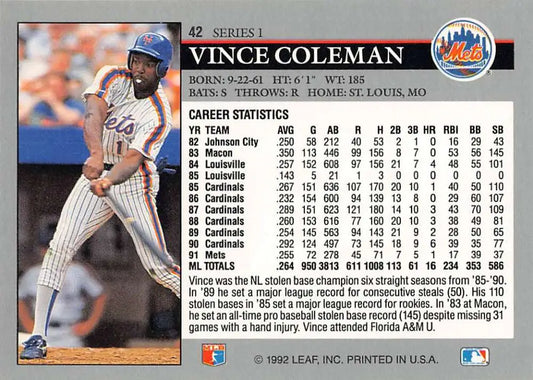 1992 Leaf #42 Vince Coleman NM-MT New York Mets Baseball Card
