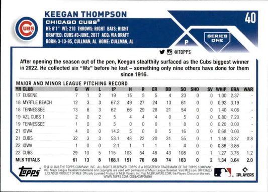 2023 Topps #40 Keegan Thompson NM-MT Chicago Cubs Baseball Card