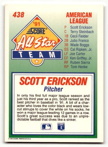 1992 Score #438 Scott Erickson Minnesota Twins Baseball Cards EX/NM ID:60460