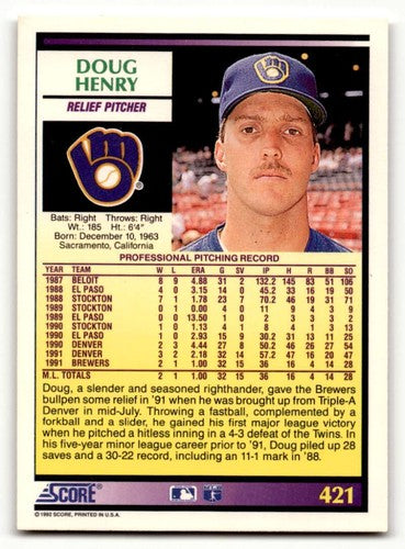 1992 Score #421 Doug Henry Milwaukee Brewers Baseball Cards EX/NM ID:60461