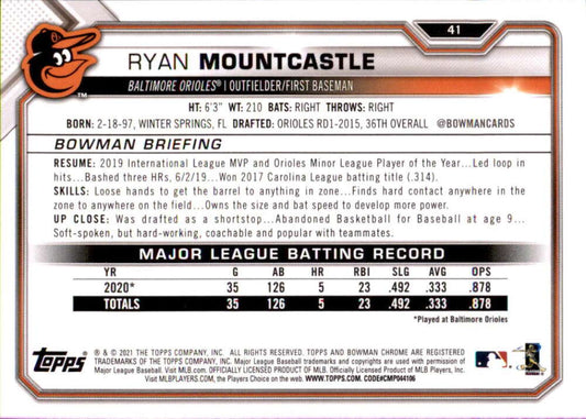 2021 Bowman #41 Ryan Mountcastle NM-MT RC Rookie Baltimore Orioles Baseball Card