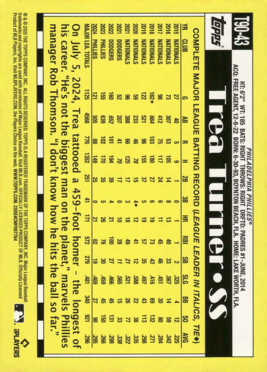 2025 Topps 1990 Baseball #T90-43 Trea Turner NM-MT Philadelphia Phillies Baseball Card
