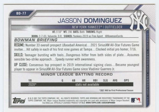 2021 Bowman Draft #BD-77 Jasson Dominguez NM-MT New York Yankees Baseball Card