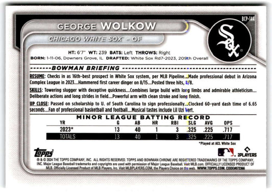 2024 Bowman Mega Box Mojo Prospects Refractor #BCP-144 George Wolkow NM-MT Chicago White Sox Baseball Card