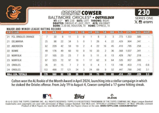 2025 Topps #230 Colton Cowser NM-MT Baltimore Orioles Baseball Card