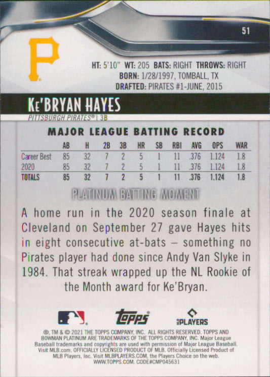 2021 Bowman Platinum #51 Ke'Bryan Hayes NM-MT RC Rookie Pittsburgh Pirates Baseball Card