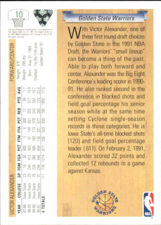 1991-92 Upper Deck #10 Victor Alexander NM-MT RC Rookie Golden State Warriors Basketball Card