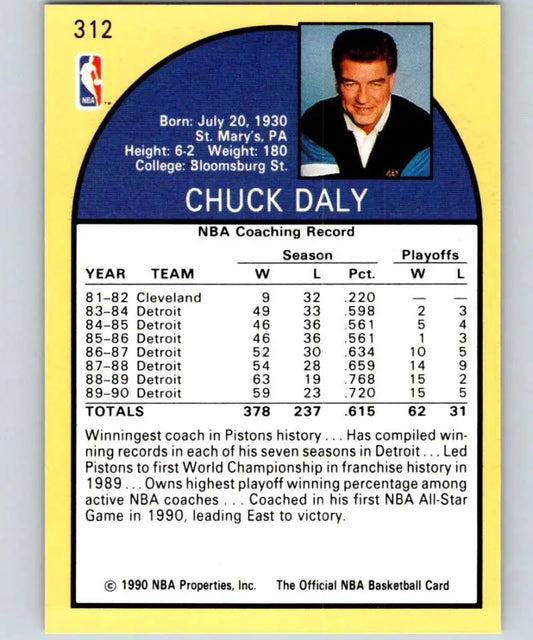1990-91 Hoops #312 Chuck Daly CO NM-MT Detroit Pistons Basketball Card