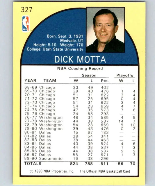 1990-91 Hoops #327 Dick Motta CO NM-MT Sacramento Kings Basketball Card