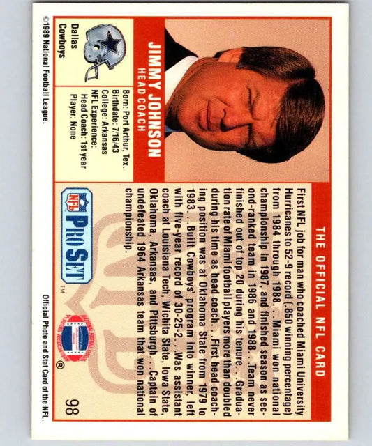 1989 Pro Set #98 Jimmy Johnson CO NM-MT RC Rookie Dallas Cowboys Football Card
