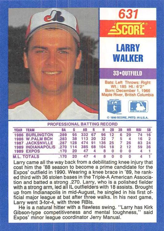 1990 Score #631 Larry Walker NM-MT RC Rookie Montreal Expos Baseball Card