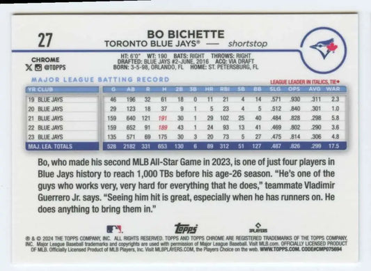 2024 Topps Chrome #27 Bo Bichette NM-MT Toronto Blue Jays Baseball Card