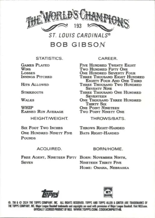 2024 Allen & Ginter #193 Bob Gibson NM-MT St Louis Cardinals Baseball Card